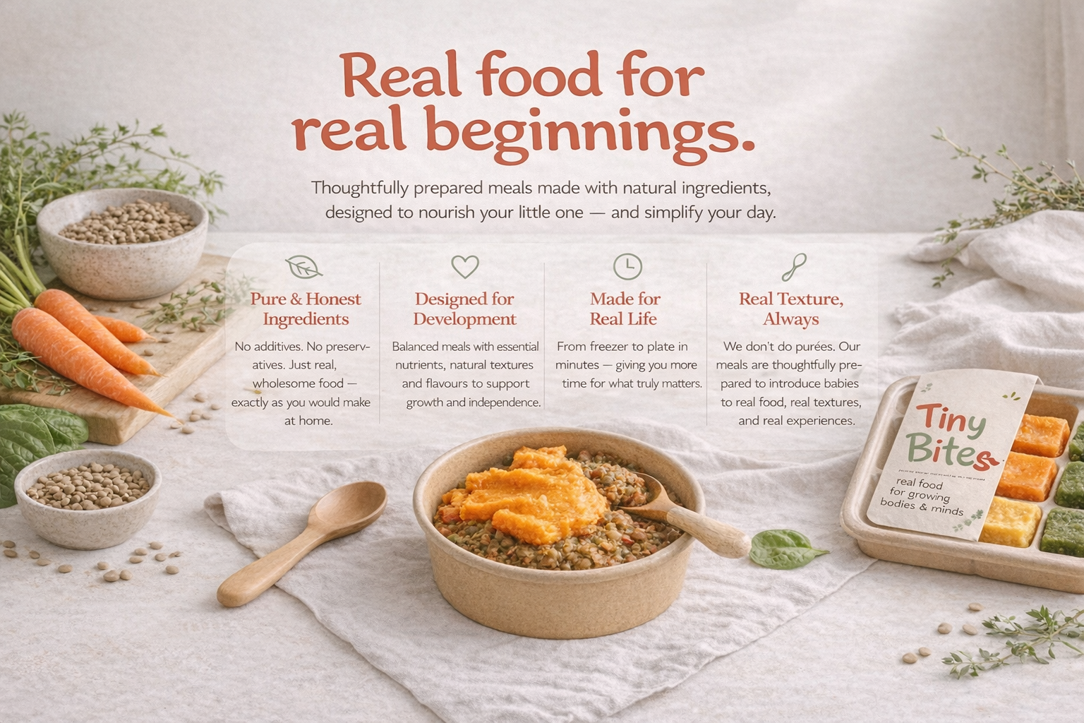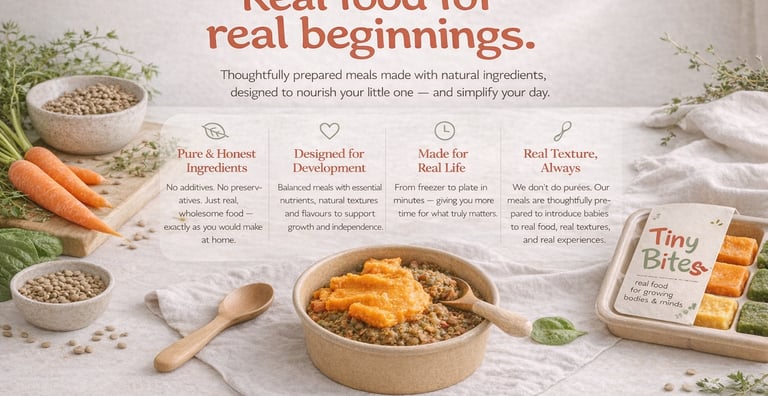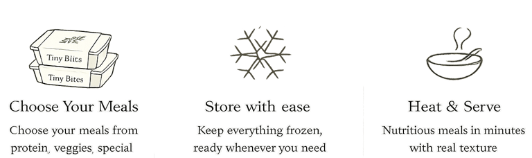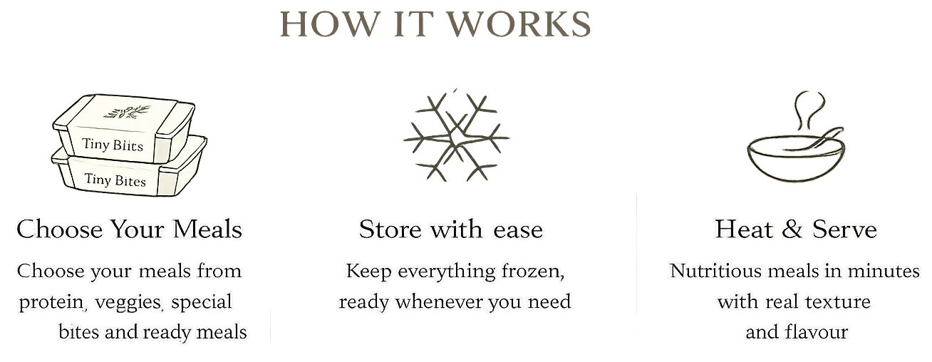 Fresh ingredients → gently cooked → frozen in cubes → ready in minutes.